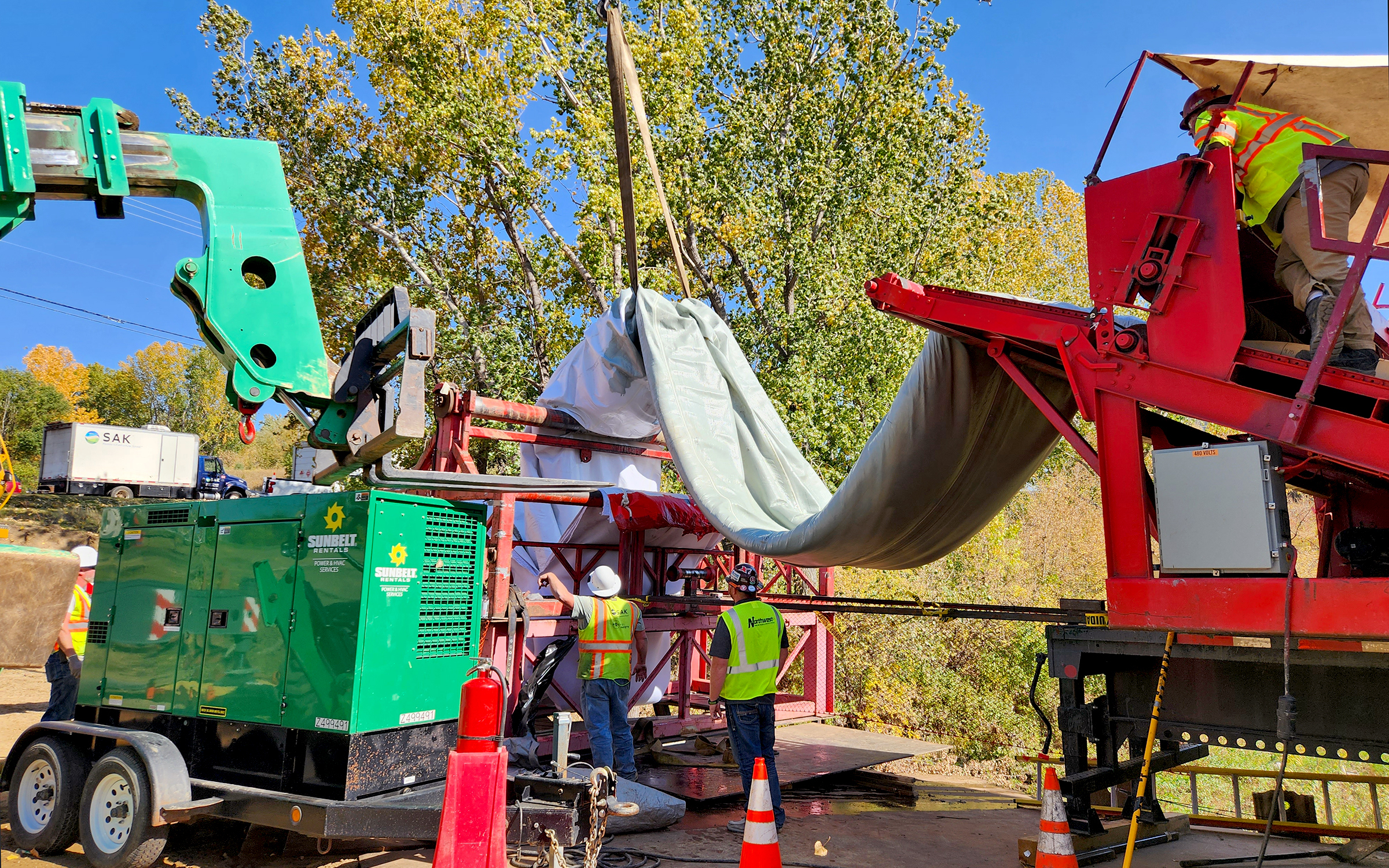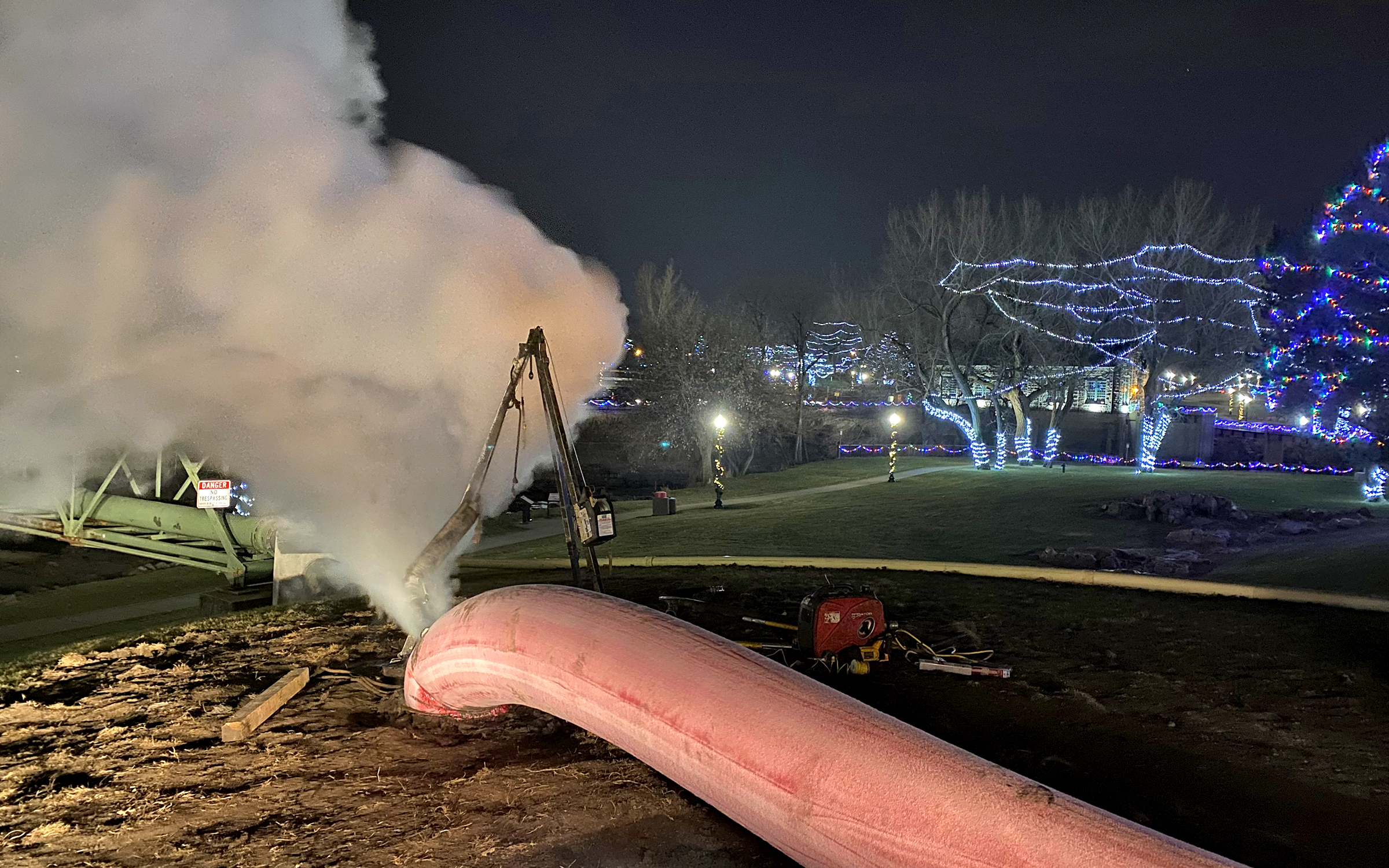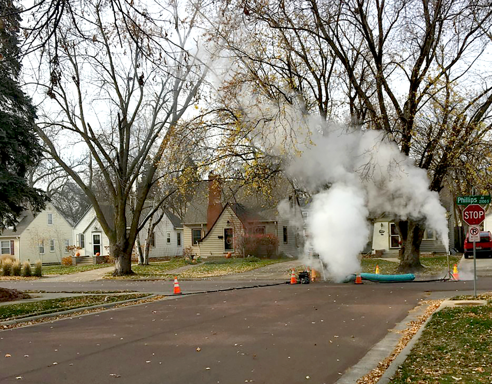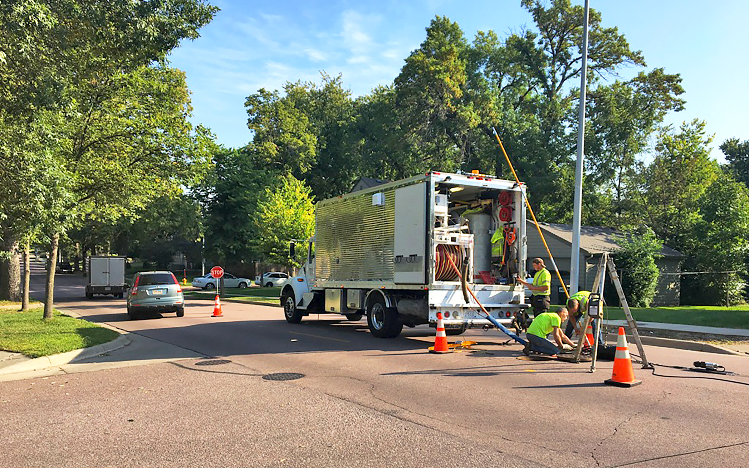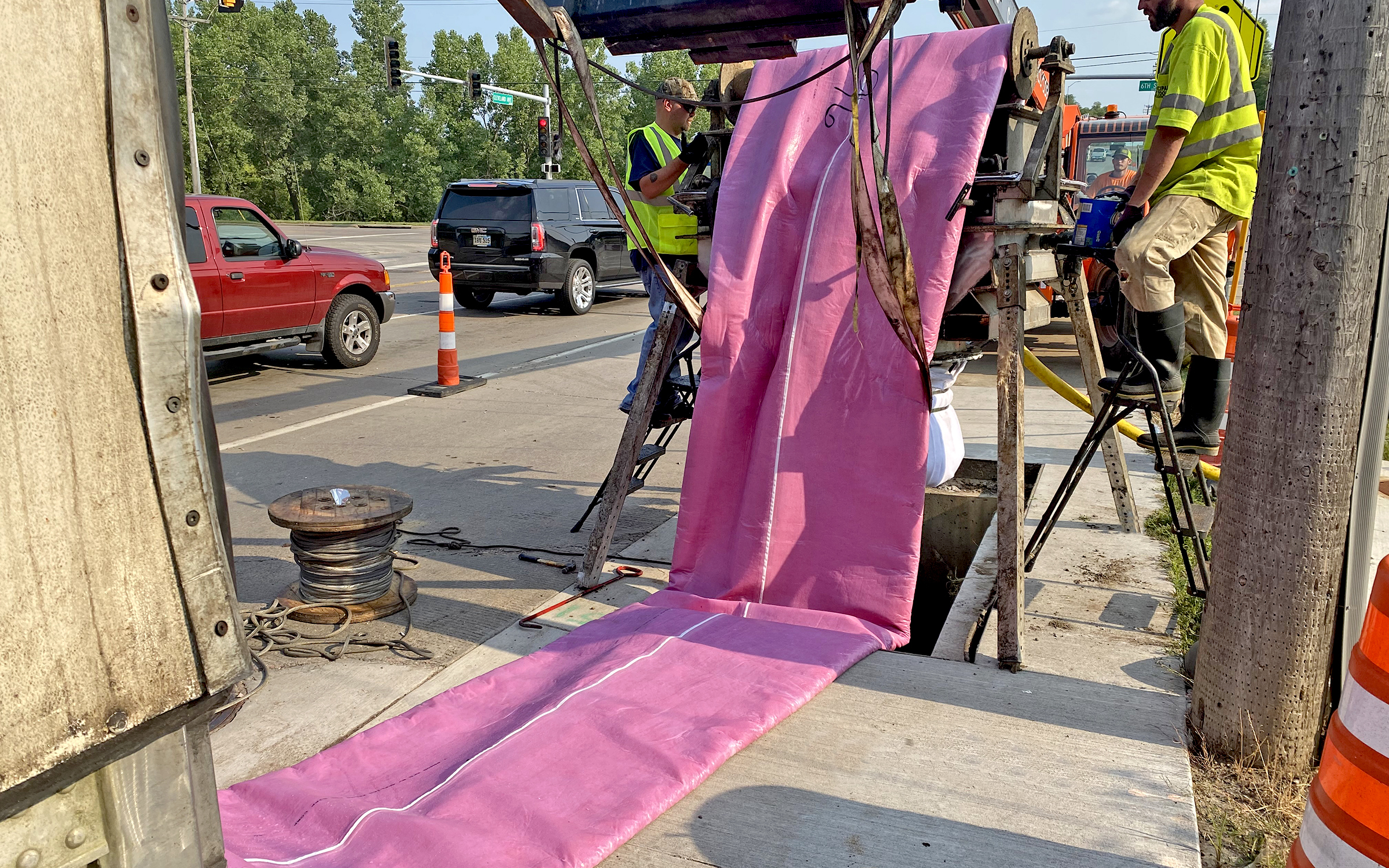 Project 1: This project included a section of 20” pipe that crosses over the Big Sioux River at Falls Park. This was a critical project because of the existing pipe condition and location: it needed to be replaced quickly with minimal disruption to the park. After cleaning and inspection with a robotic camera, a soft, resin-imbued felt liner was routed through existing pipes. Once the liner was in place, it was expanded and cured with steam or pressurized hot water. The result is a new, seamless pipe that will last for decades.