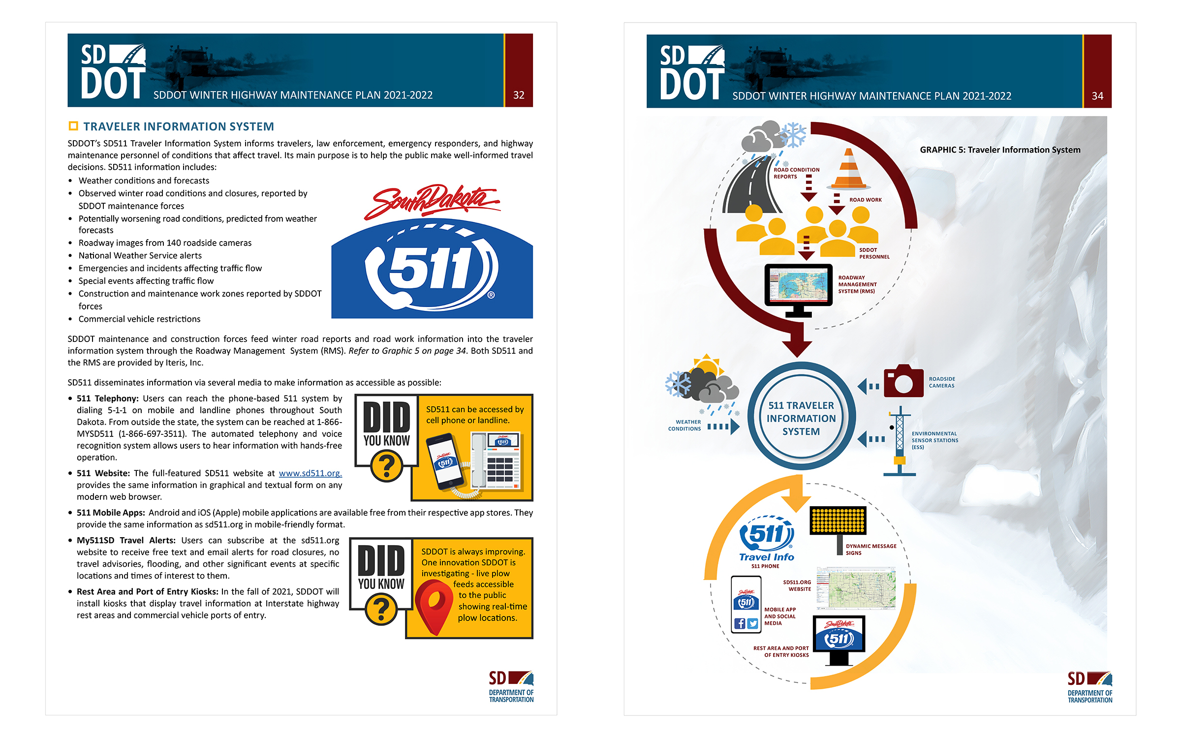 In addition to text, the graphic layout of the manual incorporated the recently updated SDDOT branding which included a new logo and color palette. The Banner team created graphics, maps, photos, and infographics to visually demonstrate the many aspects of information into an understandable concept. The layout was designed for straightforward progression and the ability to locate specific information quickly. This was done through color, icons, and consistency.